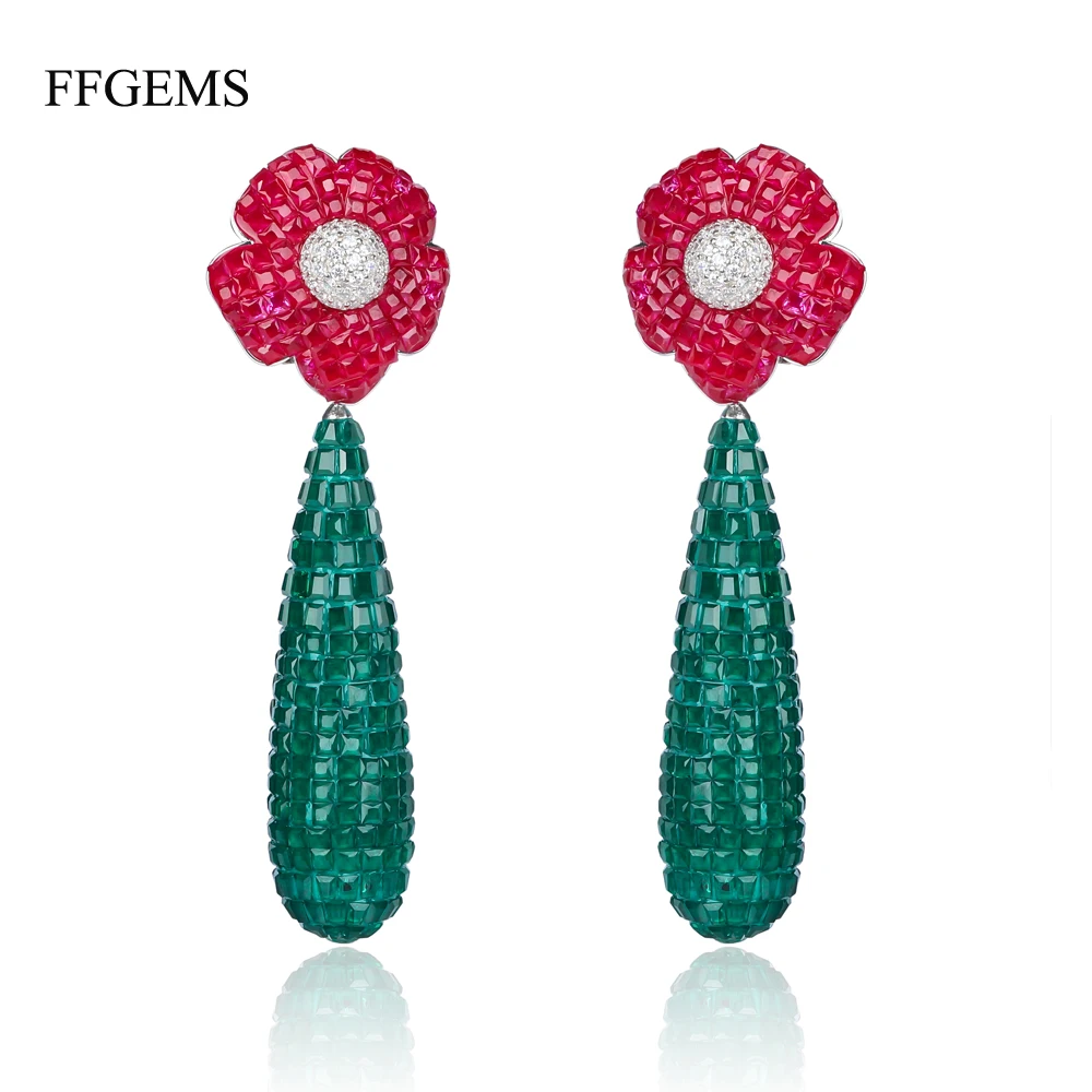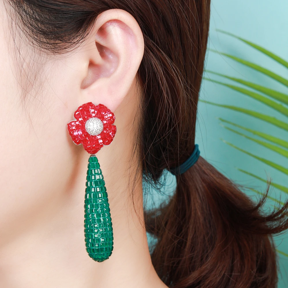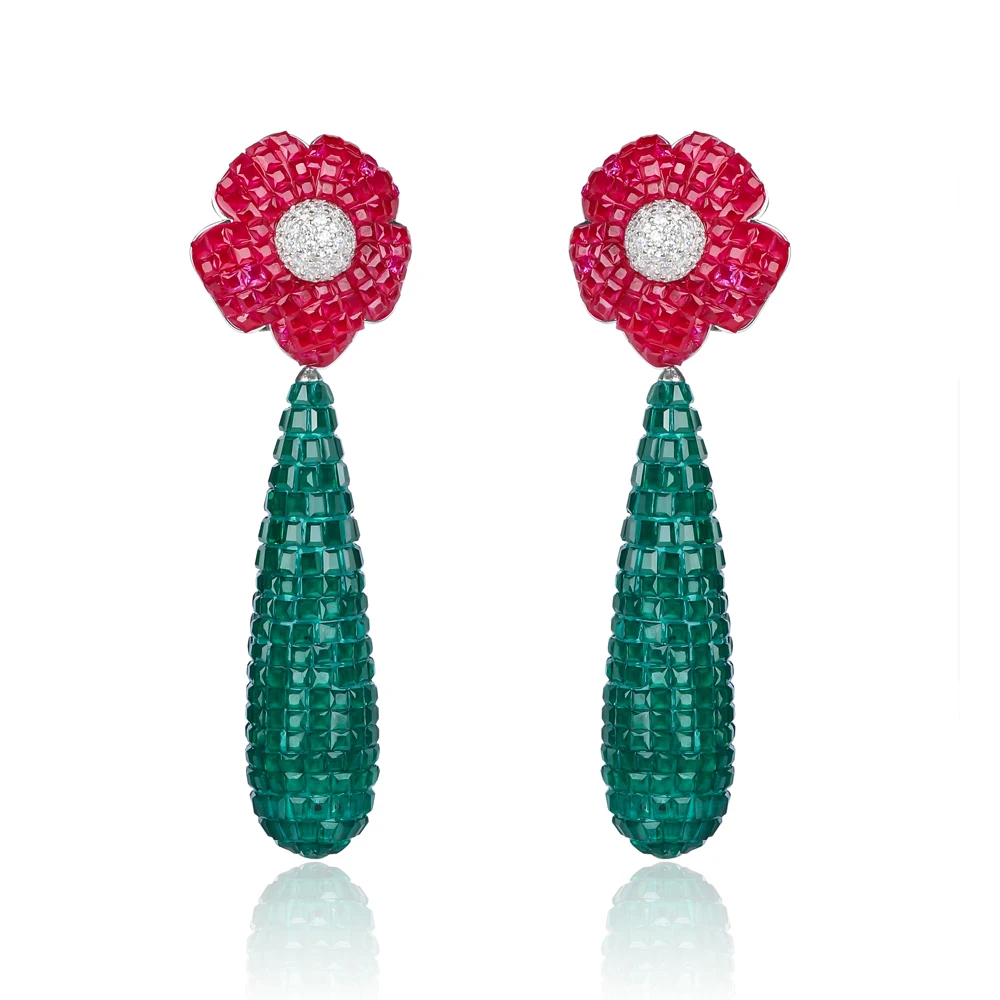 Embrace Luxury with Silver Drop Big Earring Flower Created Nano Ruby Emerald